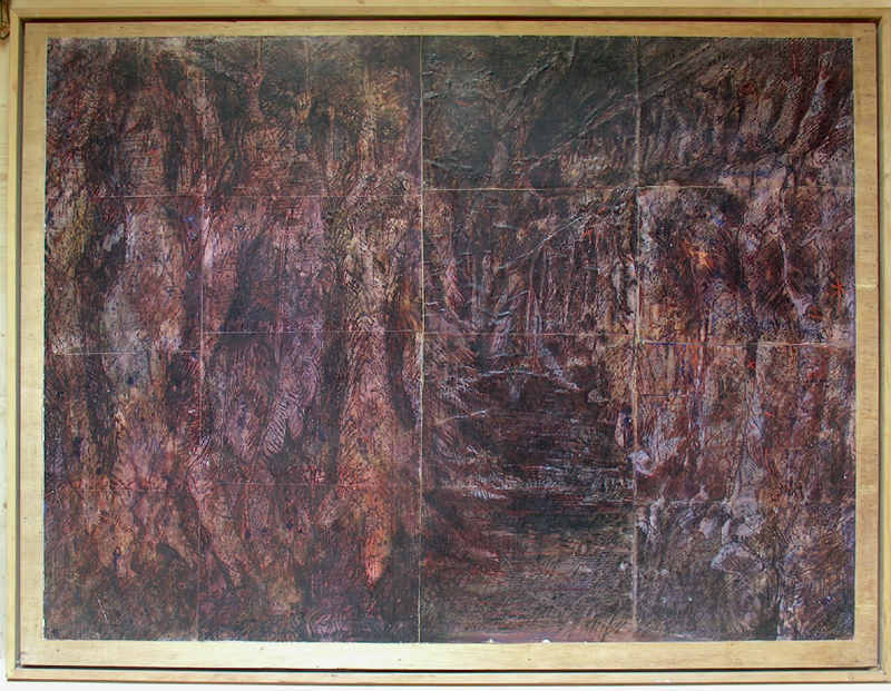 Federzeichnungen schlachthof in Passau• Collage auf Holzplatte • 110 cm x 150 cm • 1995
